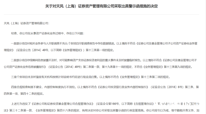 资产证券化业务违规, 天风资管被上海证监局“点名”